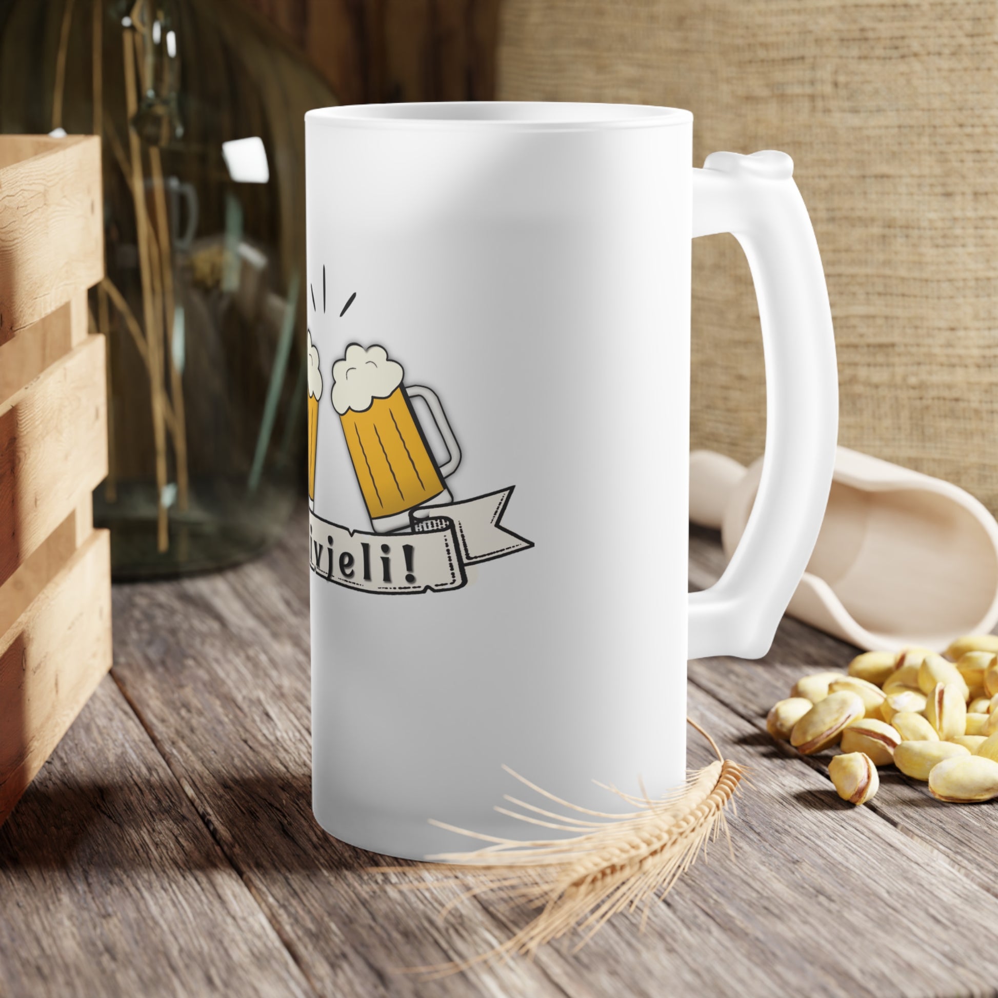 Krigla je od mutnog stakla zapremnine 470 ml, te dolazi u setu sa podmetačem i metalnim otvaračem za boce.